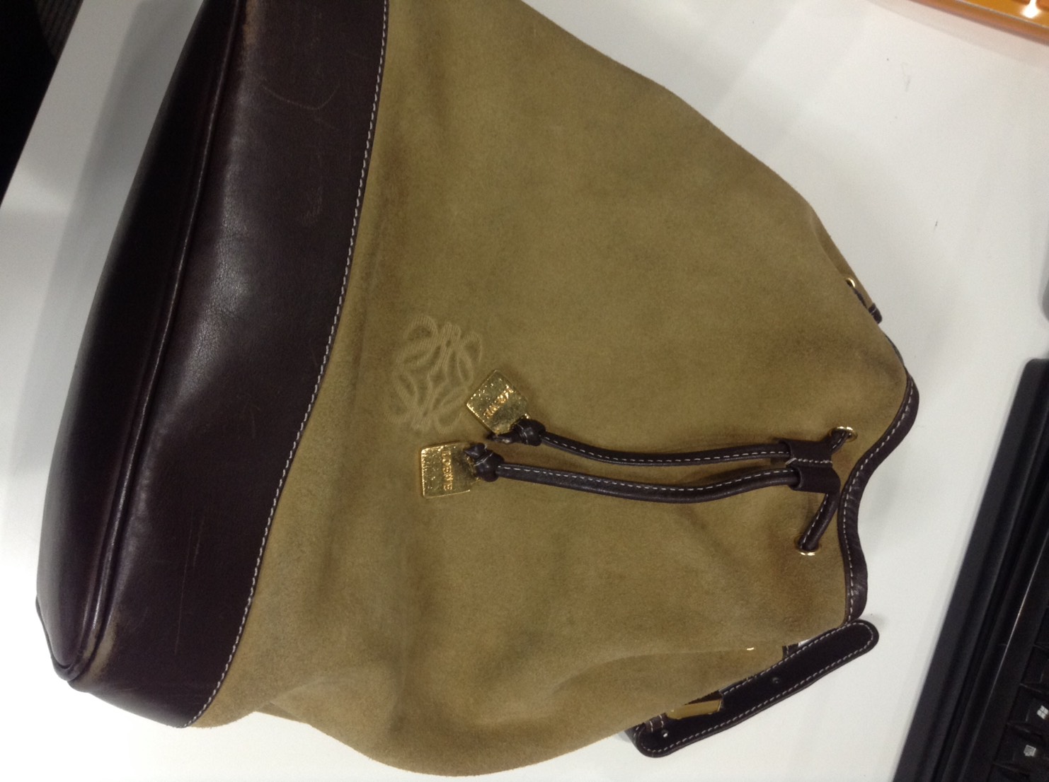 スエードとブラウンの色使いがシンプルで使いやすいロエベの巾着ショルダーです。デイリー使いに丁度良いサイズ感になっております♪