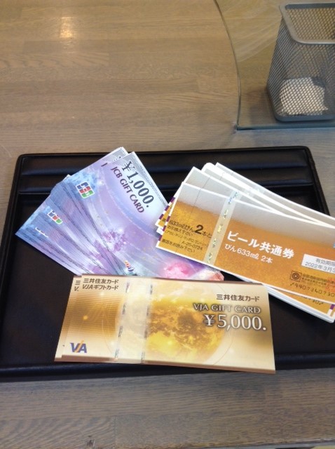 商品券をお買取りしました。当店の商品券の買取利率は全国で見てもトップクラスです。ぜひお近くで済まさず、船橋に立ち寄った際にはお売りください。