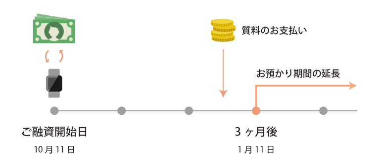 流失期限までに経過した質料(お利息)をお支払いいただくとお預り期間を延長することができます。すぐに融資金額をご用意できなくても、お品物が流失することはございません。 お利息は1ヵ月単位で発生しますのでご注意ください。