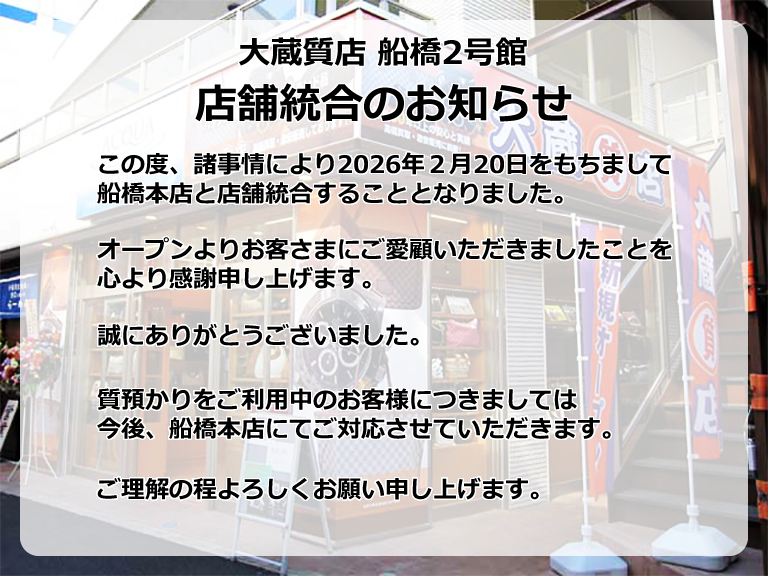 質預かりをご利用中のお客様につきましては今後、船橋本店にてご対応をさせていただきます。